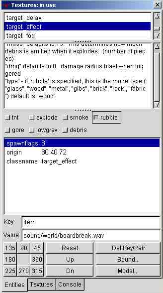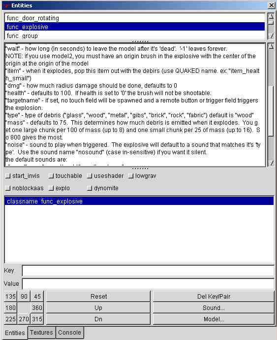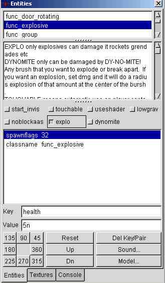 Anschliessend drückst du wieder "N" um das Entity-Fenster aufzurufen: Hier aktivieren wir "explo". Das bedeutet, diese Wand kann man mittels Rockets usw. sprengen. Natürlich kannst du auch "dynomite" wählen, dann ist diese Wand wirklich nur mit Dynamit zu sprengen.