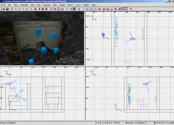 Du drückst jetzt in der Top Ansicht 2x mit der rechten Maustaste und wählst im Menü "target" und da "target_effect". Es erscheint eine blaue Box, unser "Target". Nun drückst du "N" um die Eigenschaften dieses Targtes festzulegen: Wir aktivieren das Feld "rubble" Diesen "target" setzt du nun vor die Tafel: Das wiederholst du nun ein paarmal, bis du 3 - 5 Stück dieser "target_effect"s vor deiner Karte stehen hast. Nun markierst du zuerst einen "target_effect", anschliessend die Tafel. Nun drückst du "STRG" + "K" (du hälst "STRG" gedrückt und drückst noch dazu "K") den Target mit der Karte zu verbinden. Wenn du das richtig gemacht hast, müsstest du jetzt einen blauen Strich zwischen dem Target und der Karte sehen. Jetzt drückst du die "ESC"-Taste um alles zu deselektieren. Das wiederholst du jetzt bei allen targets, die du gesetzt hast. Aber denk dran, immer nur einen einzelnen target markieren, dann die Tafel, dann "STRG" + "K" drücken. Machst du hier etwas falsch, funktioniert es nachher nicht. Wenn du alles richtig gemacht hast, sieht es so aus: Das hätten wir also. Nun kümmern wir uns um das Schild mit der Aufschrift "Eintritt verboten". Dieses Schild wollen wir auch zerstörbar machen. Also klicken wir es wieder an und klicken in der Top Ansicht 2x mit der rechten Maustaste und wählen "function" und als Unterpunkt "function_explosive". Du drückst "N" und gibt folgende Keys und Values ein: key: health ausserdem aktivierst du wieder "notblockaas" und "useshader". Du drückst "ESC" um alles zu deselektieren Nun setzt du wieder einen "target_effect" davor. Du wählst wieder "N" und aktivierst das Feld "rubble": Du drückst wieder "ESC" um alles du deselektieren. Nun wählst du erst das "target_effect" an, anschliessend das Schild. Nun drückst du "STRG" + "K". Es erscheint ein Strich, der den Target und das Schild verbindet. Damit hätten wir auch das Schild fertig. So, jetzt bleibt nur noch die Wand, die den Spieler daran hintert, den Gang bis zum Ende zu gehen. Das müssen wir natürlich ändern. An dem Eckpunkt des Ganges habe ich ein Dynamit-Packet hingelegt. Damit soll der Spieler die Wand sprengen können. Wie du siehst, habe ich diese Trennwand so aufgebaut, dass sie aus mehren kleinen Brushs besteht. Wir wollen nicht die ganze Wand explodieren lassen, da das unrealistisch aussieht. Vielmehr selektieren wir nur ein paar Brushs, die später explodieren sollen. Also wählst du ein paar Brushs aus und klickst in der Top Ansicht 2x mit der rechten Maustaste, im Menü wählst du wieder "function" und hier als Unterpunkt "function_explosive":