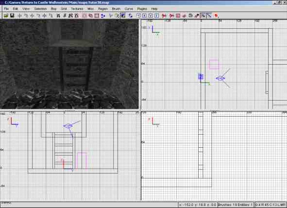 eine Leiter bauen: Verwendete Map: "tutor29.map" Dazu habe ich eine Map gebaut, die wieder aus 2 Ebenen besteht, der Player startet unten und soll mittels einer Leiter die obere Ebene erreichen. Dazu baust du dir jetzt ersteinmal einen Brush, der an der der Mauer sitzt und bis an den Boden der oberen Ebene reicht. Dann kopierst du diesen Brush und setzt ihn etwa 64 Units Entfernung ebenfalls an die Mauer. Dann setzt du noch Sprossen an die beiden Holme, dass es ungefähr so aussieht: Jetzt haben wir nur eine Ansammlung von Brushs. Und jetzt bauen wir uns erst die Leiter. Diese ist lediglich eine Textur, nämlich die Textur "common/ladder". Also machst du einen neuen Brush, den du bündig vor die Leiter setzt, die wir gerade gebaut haben. Nun wählst du nun im Menüpunkt "Textures" den "Common"-Ordner aus und wählst hier die Textur "ladder". Das wars. Also köntest du eigentlich auch z.B. eine Regenrinne bauen - und aussen herum einen weiteren Brush mit der "common/ladder"-Textur machen. Dann könntest du die Regenrinne hochklettern. |