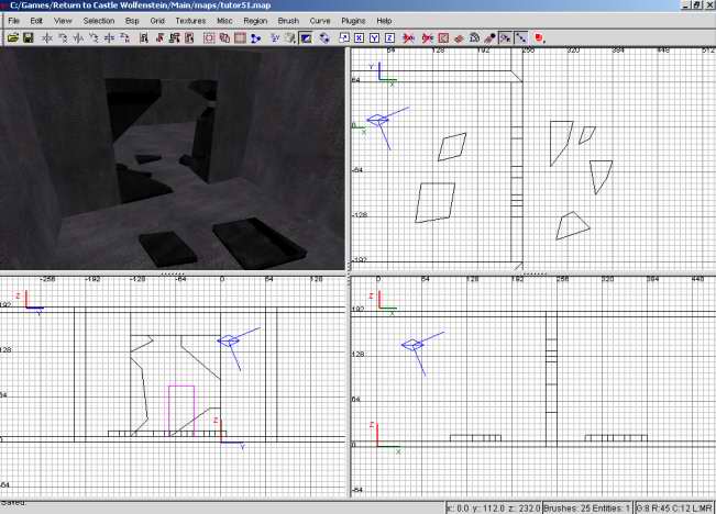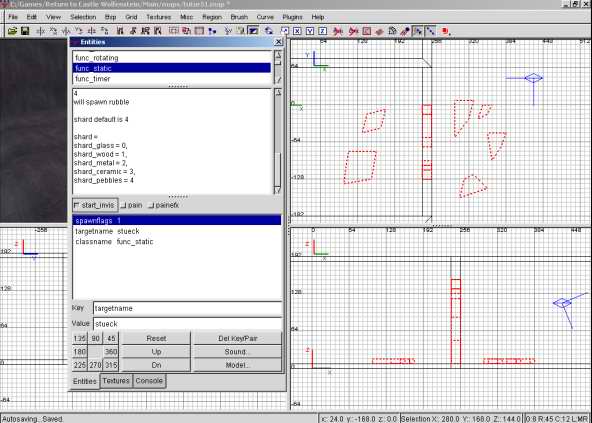 "tutor51.map" Wie du sicher bei den Explosionen gesehen hast, bleiben da ja keine Bruchstücke liegen. Zwar liegen meistens noch ein paar kleine Brocken herum, aber die verschwinden ja dann. Hier will ich dir zeigen, wie man nach einer sauberen Explosion auch ein wenig Sauerei liegenbleibt. Dazu brauchen wir natürlich erstmal ein geeignetes Objekt, welches dann später gesprengt wird: Also gut - hier siehst du die Beispielmap - ich habe hier schon die kaputte Wand gebaut, ausserdem liegen ein paar Bruchstücke um die Wand herum. Nun selektierst du einfach alle Bruchstücke der Wand: So, nun lässt du alle Stücke selektiert, und klickst 2 x mit der rechten Maustaste. Hier wählst du "func/func_static". Nun drückst du die Taste "N" um das Entity-Fenster zu öffnen. Nun gibst du folgendes ein: Key: "targetname" ausserdem aktivierst du noch die Funktion "start_invis": So, hier siehst du nun alle notwendigen Keys fertig eingetragen. Nun kannst du das Entity-Fenster schliessen. Nun drückst du die Taste "H" um alle Bruchstücke zu verstecken. Nun bauen wir in unsere Maueröffnung eine schöne, ganze Mauer. Du kannst hier auch eine Türen-Textur verwenden. Wichtig ist dabei nur, dass die Türe ja nicht funktioniert, Nun selektierst du nur den neuen Wand-Brush und klickst 2x mit der rechten Maustaste und wählst "func/func_explosive". Nun drückst du gleich noch die "N"-Taste, denn wir wollen auch hier noch ein paar Keys hinzufügen: