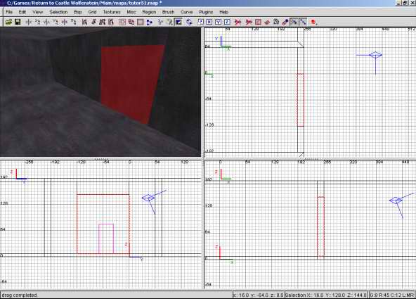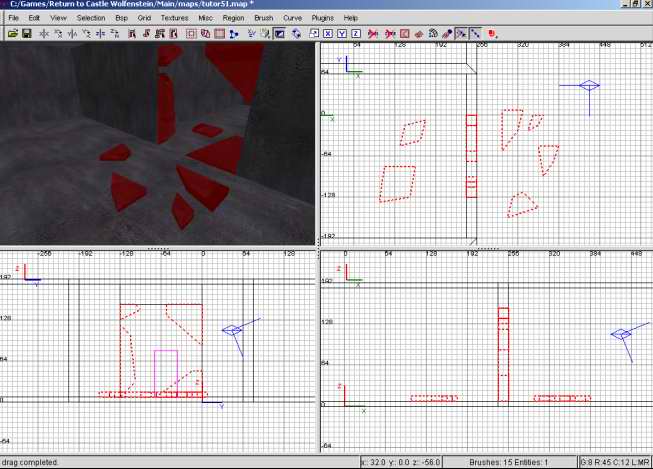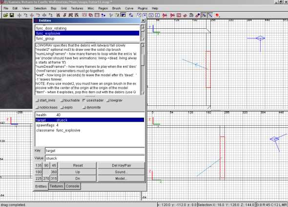 und dann aktivierst du noch die Funktion "useshader". Das brauchst du nicht unbedingt, aber wenn du auf dem explodierenden Brush eine Textur mit einem Shader verwendest, musst du diese Funktion aktivieren, sonst funktioniert der Shader nicht. So, hier erkläre ich dir schnell, was wir jetzt eigentlich gemacht haben. Wir haben den Bruchstücken ja den Namen "stueck" zugewiesen und nun ziehlt die ganze Mauer auf die Bruchstücke. Somit haben wir die beiden Entities verknüpft. Den Health-Wert von 40 habe ich deshalb gewählt, weil er ziemlich niedrig ist. Natürlich kannst du auch einen höheren Wert eingeben oder auch die Funktion "DY-NO-MITE" aktivieren. Drückst du nun die "ESC"-Taste um alles zu deselektieren, müsste auf der einen Seite ein blauer Strich erscheinen, der die ganze Wand mit einem Bruchstück verbindet. Dann mal nichts wie compilieren und auf die Wand schiessen. Wir hätten es auch anders machen können, in dem du zuerst die Bruchstücke und die Mauer baust und dann die beiden Entities verknüpst und zum Schluss die Türe in die Öffnung geschoben.