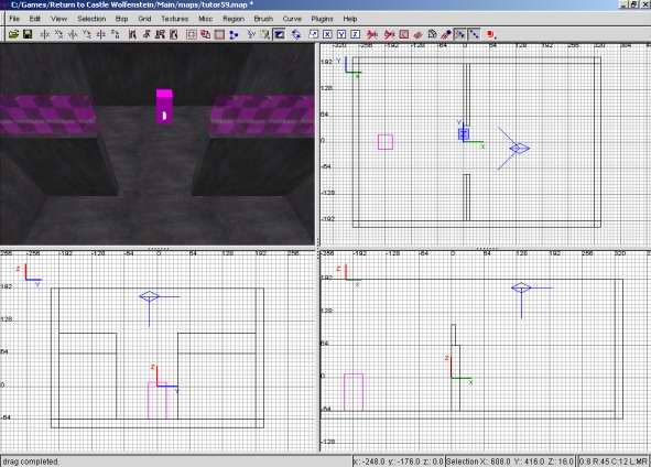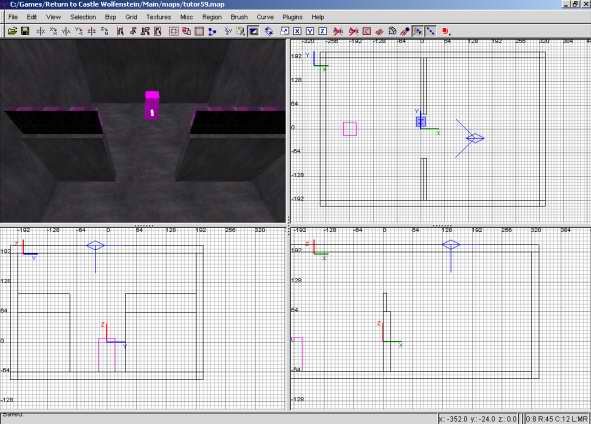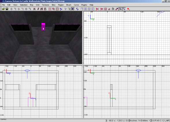 Diese beiden Punkte lassen sich natürlich umgehen. Zuerst erledigen wir Punkt 2, da er sehr leicht zu erledigen ist - dazu erstellst du einfach 2 Brushes an der Seite des Nodraw-Brushes: Nun kommen wir zum Problem Nr. 1. Je nachdem, wieviel Realismus du in deiner Map haben willst, kannst du nun wählen, ob der Stacheldrahtzaun "nur" als Sperre dienen soll, oder ob er auch gleich Schaden verteilen soll, wenn sich eine Spielfigur dem Zaun nähert.