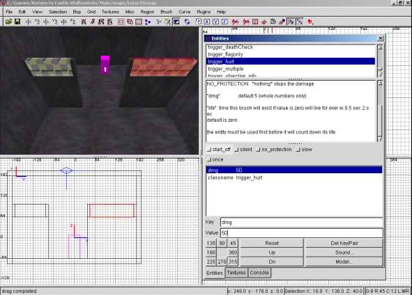 Hierzu baust du um den Stacheldraht noch einen weiteren Brush, den du mit der Textur "Trigger" (diese findest du unter "common/trigger") belegst. Nun lässt du den Trigger-Brush selektiert und klickst 2 mal mit der rechten Maustaste und wählst hier "Trigger" und als Unterpunkt "trigger_hurt". Nun drückst du die Taste "N" um das Entity-Fenster zu öffnen. Hier gibst du ein: