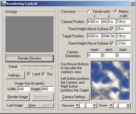 Die Position der Kamera und des Ziels (Fokus) in der Landschaft.